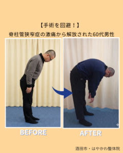 【症例報告】脊柱管狭窄症による歩行困難と手術宣告からの回復 「もう手術しかない」と言われた脊柱管狭窄症が劇的改善。 100mの歩行が限界だった私が、1km以上歩けるようになり旅行を楽しめるまで。 ![]() ![]() 酒田市・60代・男性・製造業・T様の体験談 【当院へ来院される前は、どのようなお悩みがありましたか?】 30年以上前から腰痛があり、騙し騙し生活してきましたが、6年前から悪化し、半年前からは体を前に倒すこともできず、ズボンや靴下を履くのも、朝起き上がるのも激痛とシビレが走る状態でした。 100m歩くと休まないと歩けない状態と、尿もれまで始まり、整形外科の先生からは「そろそろ手術を考えたほうがいい」と言われ、とても落ち込みました。